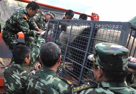 Soldiers of the Armed Police carry giant pandas onto a vehicle before transporting them to the Ya'an preservation zone, in the China Giant Panda Protection and Research Center based in Wolong which is only 30 kilometers from the epicenter of last week's 8.0-magnitude earthquake on Richter scale, southwest China's Sichuan Province, May 23, 2008. Eight other giant pandas from quake-hit Sichuan Province will be airlifted to Beijing on May 24 so that the animals can have a better breeding and recovery environment. [Xinhua]