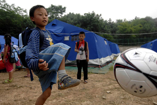 A pupil plays football during a class interval outside their camp classroom in Jiuzhou Stadium in Mianyang City of Sichuan Province May 23, 2008. Nearly 1,000 students from the neighboring quake-affected areas have resumed classes in the temporary camp school. [Xinhua]