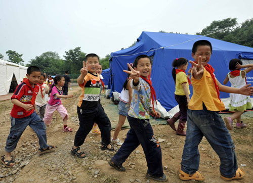 Pupils pose in front of their camp classroom outside Jiuzhou Stadium in Mianyang City of Sichuan Province May 23, 2008. Nearly 1,000 students from the neighboring quake-affected areas have resumed classes in the temporary camp school. [Xinhua]