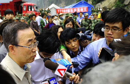 United Nations Secretary-General Ban Ki-moon (L) speaks to reporters during his visit to Yingxiu town of Wenchuan County, epicenter of the May 12 earthquake in southwest China's Sichuan Province, May 24, 2008. [Xinhua]