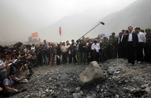 Chinese Premier Wen Jiabao (R Front) speaks during an interview with journalists in Yingxiu Town of Wenchuan County, Southwest China's Sichuan Province, May 24, 2008, during his second inspection tour of quake-hit areas in Sichuan after the May 12 earthquake. [Xinhua]