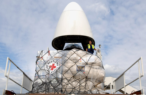 A man works on a plane, which is transporting relief materials to China, at the airport in Berlin, May 22, 2008. On Thursday, Germany donated 120 tents and a mobile hospital which can look after 250,000 people in China's earthquake-hit areas. [people.com.cn]