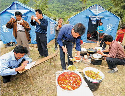 Quake survivors have lunch near their tents in Nanba, Pingwu county, Sichuan province May 23 2008. [China Daily]