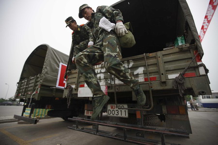 Soldiers jump out of a truck before leaving for the Tangjiashan quake lake on foot near Beichuan county, Sichuan province May 25, 2008. The Tangjiashan quake lake, 3.2 km upstream from the devastated Beichuan county seat, was formed because massive landslides partially blocked the Qianjiang River. [Xinhua]