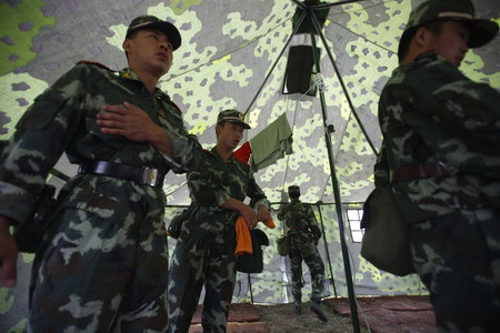 Soldiers prepare to head to the Tangjiashan quake lake on foot in a tent near Beichuan county, Sichuan province May 25, 2008. The Tangjiashan quake lake, 3.2 km upstream from the devastated Beichuan county seat, was formed because massive landslides partially blocked the Qianjiang River. [Xinhua]