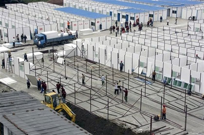Construction workers work on a resettlement site for the victims of the May 12 quake in Dujiangyan, southwest China's Sichuan Province, May 20, 2008. A resettlement residence project has started here on May 17 and is expected to be ready on May 27. [Xinhua]