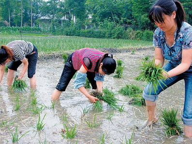 Farmers in Jianhua village in Dujiangyan transplant rice paddy on May 26, 2008. People in some places in quake-hit Sichuan province have started returning to the fields. [China Daily]