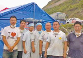Zhang Qian (left) and some volunteers in front of a clinit tent near Yingxiu town, Sichuan province May 17, 2008. [China Daily]