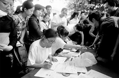 China Da Di Property Insurance Co employees handle claims of parents whose children were killed in the quake on May 18 2008. [China Daily]