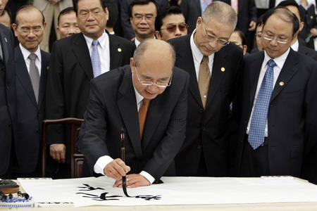 Kuomintang (KMT) Chairman Wu Poh-hsiung (C) writes a couplet for Dr. Sun Yat-sen's Mausoleum --"tian xia wei gong, ren min zui da", which read "the world is for all, all is for people" in Nanjing, capital of east China's Jiangsu Province, May 27, 2008. Wu Poh-hsiung paid homage to Dr. Sun Yat-sen's Mausoleum on Tuesday. [Agencies]