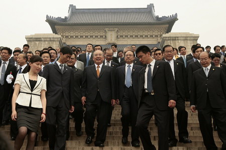 Kuomintang (KMT) Chairman Wu Poh-hsiung (C) tours Dr. Sun Yat-sen's Mausoleum in Nanjing, capital of east China's Jiangsu Province, May 27, 2008. [Agencies]