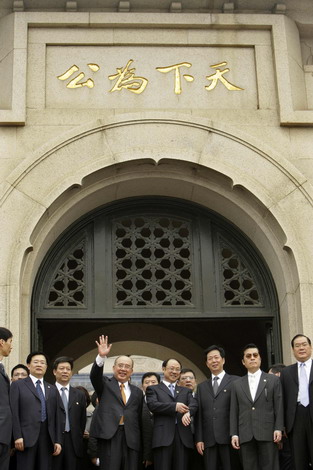 Kuomintang (KMT) Chairman Wu Poh-hsiung (C) tours Dr. Sun Yat-sen's Mausoleum in Nanjing, capital of east China's Jiangsu Province, May 27, 2008. [Agencies]