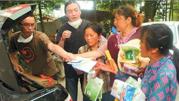 Yin Xiaojin hands out bags of milk powder to earthquake victims in a village in Deyang, Sichuan province. [China Daily]
