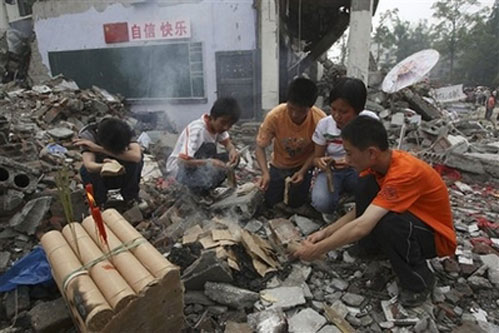 Students mourn for dead classmates in the ruins of a classroom at the collapsed Juyuan Middle School in Dujiangyan, in southwest China's Sichuan province, Tuesday, May 27, 2008. More than 270 students died when the school collapsed in the May 12 earthquake. [Agencies]