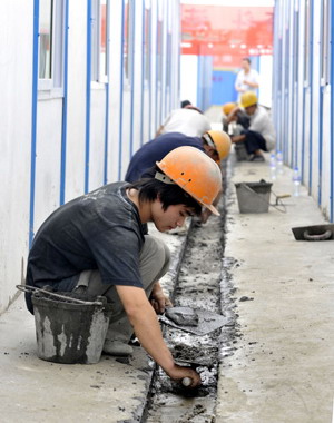 Workers build a drain of makeshift shelters for quake survivors at a temporary resettlement zone in Dujiangyan City of southwest China's Sichuan Province May 27, 2008. [Xinhua]