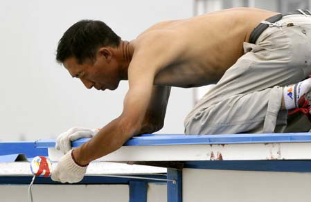 A worker builds makeshift shelters for quake survivors in Dujiangyan City of southwest China's Sichuan Province, on May 27, 2008. [Xinhua]
