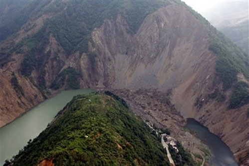 The Tangjiashan quake lake formed by the landslide following the May 12 earthquake near Beichuan County in southwest China's Sichuan Province is seen on Monday, May 26, 2008. Chinese officials rushed Tuesday to evacuate people in the path of potential floodwaters building up behind a quake-spawned dam as soldiers carved a channel to try to drain away the threat. [Xinhua]