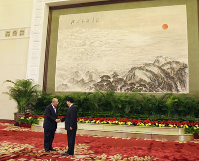 Hu Jintao (R), general secretary of the Central Committee of the Communist Party of China, shakes hands with Wu Poh-Hsiung, Chairman of Taiwan Kuomintang and his delegation at the Great Hall of the People in Beijing May 28, 2008. [Agencies]
