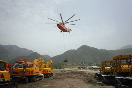 A helicopter arrives to transport heavy machinery to the Tangjiashan quake lake, in the earthquake-hit area of Leigu town in Beichuan county, Sichuan province May 28, 2008. [Agencies]