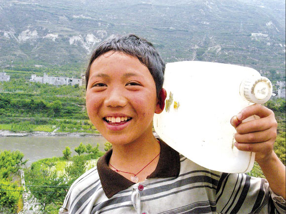 Liang Weiqiang, 13, carries water for his family in Keke village of Maoxian county. The quake destroyed the pipes that supplied drinking water to the village. Wang Xu