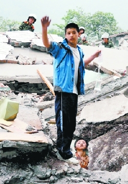 Li Yang holds an intravenous drip bottle for Liao Bo - trapped under concrete slabs of the crumbled school building in this file photo. [Xinhua]
