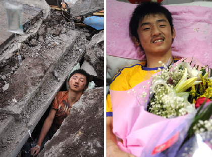 A combination of pictures shows earthquake survivor, middle school student Liao Bo under the rubble in Beichuan County, Sichuan Province, May 13, 2008, left, and in the hospital in Chongqing Municipality, on his 17th birthday, May 24, 2008, right. Liao lost his left leg in the earthquake. [Xinhua]