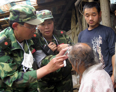 A staff from an army hospital in Beijing changes medication for an injured quake victim in a village in Yingxiu Town, Wenchuan County of Southwest China's Sichuan Province May 28, 2008. [Xinhua]