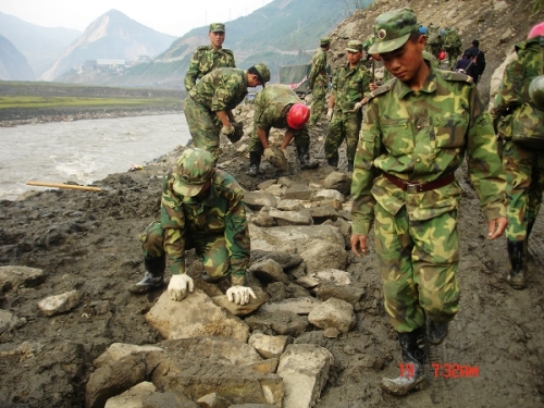 Photo taken on May 19, 2008 shows soldiers repair roads in Yingxiu Town, Wenchuan County of Southwest China's Sichuan Province. [Sina.com]