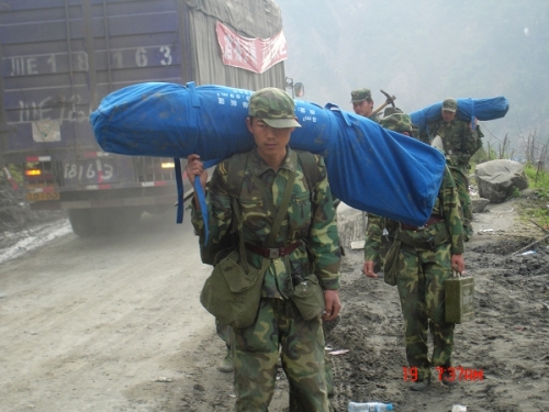 Photo taken on May 19, 2008 shows soldiers carry relief materials on a road in Yingxiu Town, Wenchuan County of Southwest China's Sichuan Province. [Sina.com]