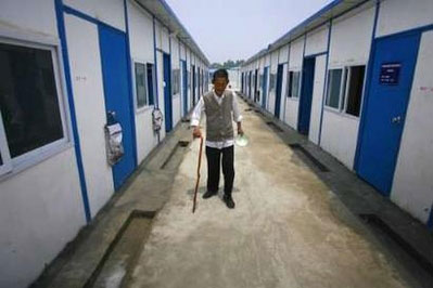 A survivor of the earthquake walks past newly constructed temporary housing in the earthquake-hit area of Dujiangyuan, Sichuan province, May 27, 2008. [Agencies]