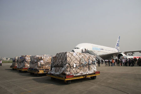 An Airbus A380 carrier carrying more than 1,100 tents for people left homeless by the 8.0-magnitude earthquake arrives in Chengdu, Southwest China's Sichuan Province, May 31, 2008. [eastday.com]