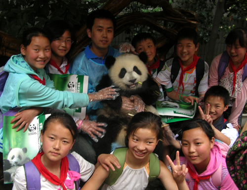 Students from the Longmenshan Town Central School in Pengzhou, Sichuan Province, have an intimate moment with the four-month-old female panda Xing Ya in the Chengdu Research Base of Giant Panda Breeding. Photos by Huang Zhiling