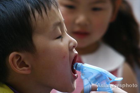 A teacher sprays medicine into a boy's mouth at a kindergarten in Fuyang, East China's Anhui province June 2, 2008. Schools in Fuyang, a city worst-hit by the outbreak of hand-foot-mouth disease (HFMD) since April, resume classes after the Children's Day as the authorities considered the situation was under control. [Asianewsphoto]