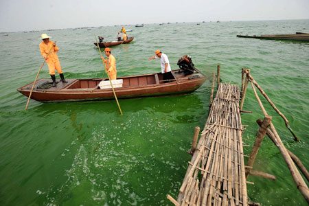 Workers row a boat on the algae-filled Chaohu lake in Hefei, East China's Anhui Province, June 3, 2008. Recently, blue-green algae has been discovered in the west part of Chaohu Lake, which is China's fifth largest body of fresh water and the drinking water source for about 320,000 people. [Xinhua]