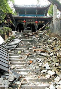 The Erwang Temple, or "Temple of Two Kings", which was built 2,000 years ago to honor Li Bing, the then governor of Sichuan, and his son for their contribution to the construction of Dujiangyan, the world's oldest irrigation project still in operation. It largely collapsed in the quake.