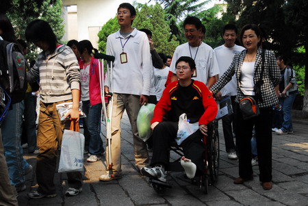 Students arrive for the first day of the annual national college entrance exam at a middle school in Yantai, east China's Shandong province, June 7, 2008. Starting Saturday, a record 10.5 million Chinese youngsters will sit for the three-day annual exam this year. [Xinhua]