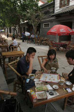 People play Chinese chess outside a teahouse in Chengdu, capital of Sichuan province, earlier this month. Life in this city of leisure is gradually returning to normal after the earthquake. [China Daily]