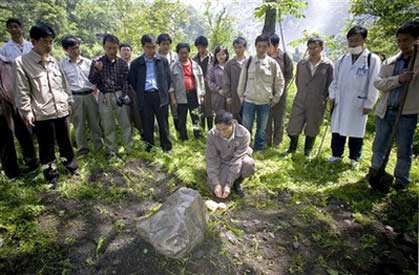 Panda keeper He Changgui (center front) and his colleagues mourn for panda Mao Mao which died in the May 12 earthquake at Mao Mao's funeral in Wolong, China's southwest Sichuan province, June 10, 2008. The nine-year-old Mao Mao was finally found Monday and dug out Tuesday, almost a month after the devastating earthquake, crushed by a wall of her enclosure as the river nearby swelled with landslide debris. [Agencies]