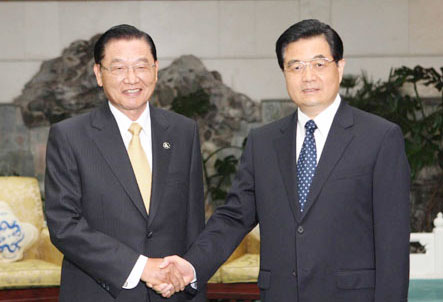 General Secretary of the Communist Party of China Central Committee Hu Jintao (R) shakes hands with Chiang Pin-kun, chairman of the Taiwan-based Straits Exchange Foundation (SEF), in Beijing June 13, 2008. [Xinhua]