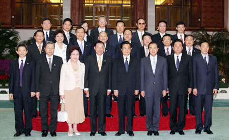 General Secretary of the Communist Party of China Central Committee Hu Jintao (4th R, front) and Chiang Pin-kun (5th R, front), chairman of the Taiwan-based Straits Exchange Foundation (SEF), pose for a group photo after their meeting in Beijing June 13, 2008. [Xinhua]