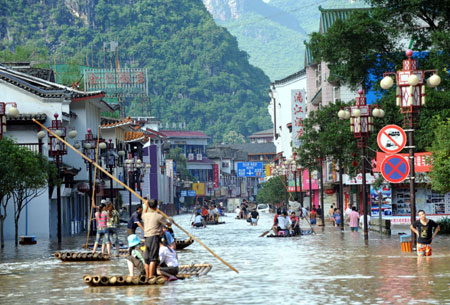 Local residents ride bamboo rafts as a rainstorm continues to lash Yangshuo, Guangxi Province over the past two days, June 13, 2008. [Xinhua] |