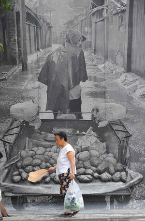A woman walks past a painting at a historical culture preservation district in Chengdu, capital of southwest China's Sichuan Province, June 13, 2008. [Xinhua]