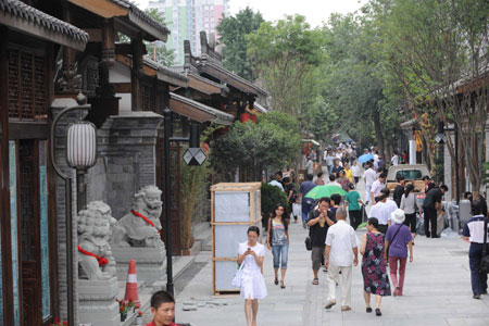 Tourists stroll at a historical culture preservation district in Chengdu, capital of southwest China's Sichuan Province, June 13, 2008. The city is trying hard to recover its tourism after the devastating earthquake in May. [Xinhua]