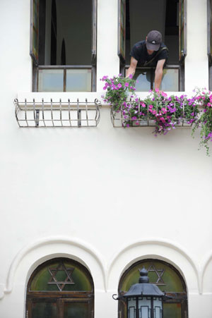 A worker decorates a French style house at a historical culture preservation district in Chengdu, capital of southwest China's Sichuan Province, June 13, 2008. [Xinhua]