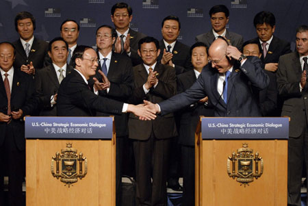 Updated: 2008-06-17 22:25 ![]() Chinese Vice Premier Wang Qishan (L) and US Treasury Secretary Henry Paulson (R) reach out to shake hands after opening remarks at the start of cabinet-level meetings at the Strategic Economic Dialogue at the US Naval Academy in Annapolis, Maryland, June 17, 2008. [Agencies]