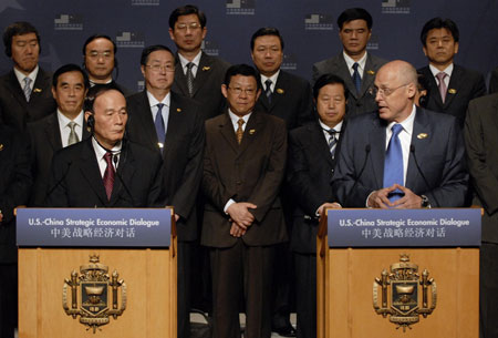 Updated: 2008-06-17 22:25 ![]() US Treasury Secretary Henry Paulson (R) gives opening remarks with Chinese Vice Premier Wang Qishan (L) at the start of cabinet-level meetings at the Strategic Economic Dialogue at the US Naval Academy in Annapolis, Maryland, June 17, 2008. [Agencies]
