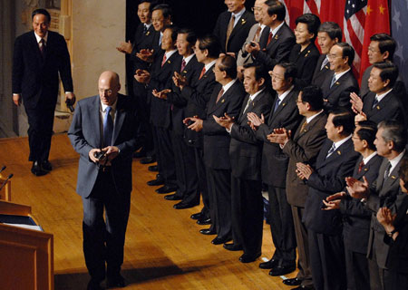 Updated: 2008-06-17 22:25 ![]() Chinese Vice Premier Wang Qishan (L) and US Treasury Secretary Henry Paulson (2nd L) arrive onstage to give opening remarks at the start of cabinet-level meetings at the Strategic Economic Dialogue at the US Naval Academy in Annapolis, Maryland June 17, 2008. [Agencies]