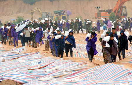 Updated: 2008-06-18 21:46 ![]() Soldiers and local residents reinforce the embankments with sandbags along the Beijing-Guangzhou Railway in Qingyuan, South China’s Guangdong Province, June 18, 2008.
