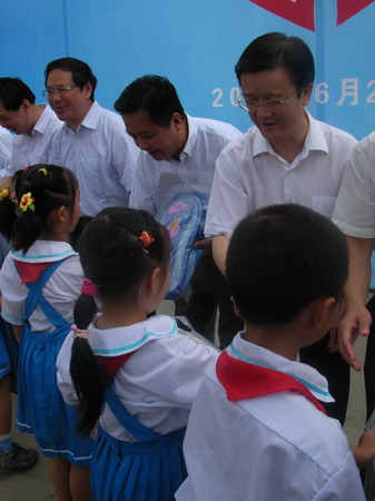 Students in the Wanchuan School receive 30,000 yuan (US$4,348) worth of schoolbags and stationery on Monday morning from officials from Anhui Province which has built the school.[China Daily/Huang Zhiling]
