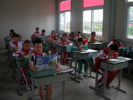 Students in Class 1, Grade 5 in the Wanchuan School attend their first Chinese class after the earthquake on Monday morning.[China Daily/Huang Zhiling]